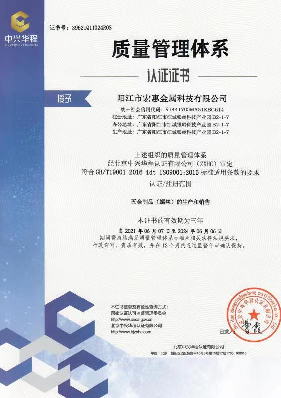 廣東宏惠金屬公司是家20多年一直專注鉆尾螺絲開發(fā)與生產(chǎn)的企業(yè),是國內(nèi)較早做鉆尾的廠家之一,同時也是國內(nèi)專業(yè)開發(fā)生產(chǎn)鉆尾螺絲的企業(yè)之一。 我司地址為于廣東省陽江市江銀嶺科技園距沈海高速白沙出口不到2公里,距陽江高鐵站也只有十余公里交通便利。 公司占地120畝,擁有超500臺套專業(yè)設(shè)計 生產(chǎn) 檢測設(shè)備。一個超200人的專業(yè)團隊,能夠嚴格按照ISO9001質(zhì)量體系要求生產(chǎn)符合GB DIN AS3566 ANSI JIS BS等標(biāo)準(zhǔn)的產(chǎn)品,生產(chǎn)銷售各種高品質(zhì)緊固件系列產(chǎn)品,為中高端客戶提供優(yōu)質(zhì)服務(wù)。也可按照客戶要求設(shè)計生產(chǎn)各種鉆尾,年產(chǎn)高品質(zhì)碳鋼 不銹鋼鉆尾螺絲2萬余噸.在各大客戶的鼎力支持下產(chǎn)品暢銷全國,并遠銷亞 非 拉 歐等地,在這20多年發(fā)展的道路上我司堅持“以質(zhì)量求生存,以信譽求發(fā)展”的精神理念不斷完善公司體系。